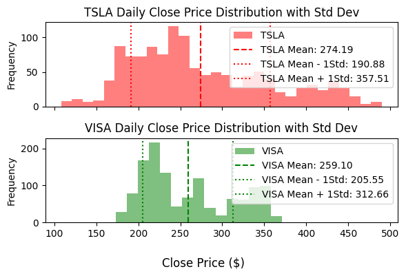 These histograms show the daily closing prices of Visa (VISA) and Tesla (TSLA) stock for the last 5 years.