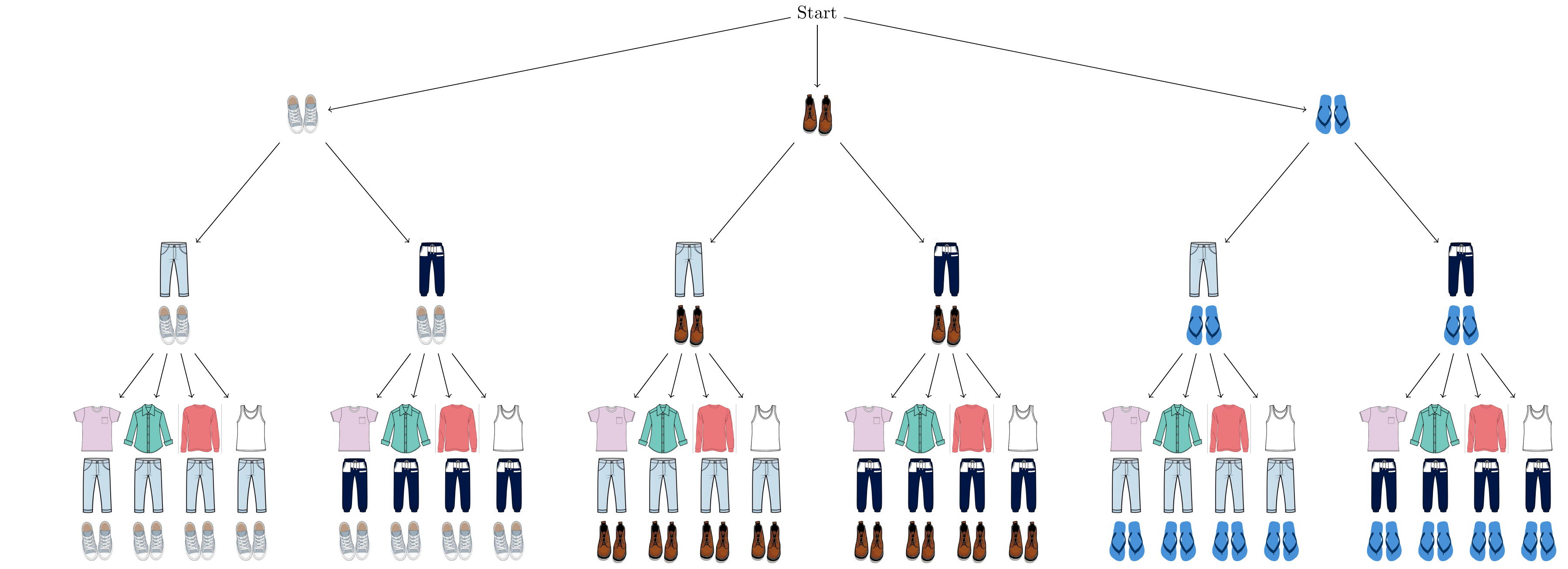 The multiplication rule says that the total number of outfits is \(3 \times 2 \times 4 = 24\).