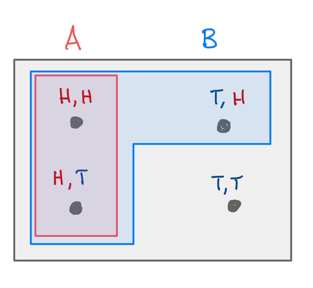 Example: You toss a fair coin twice. Let \(A\) be the even that the first toss comes up heads, and let \(B\) be the event that the second toss comes up heads.