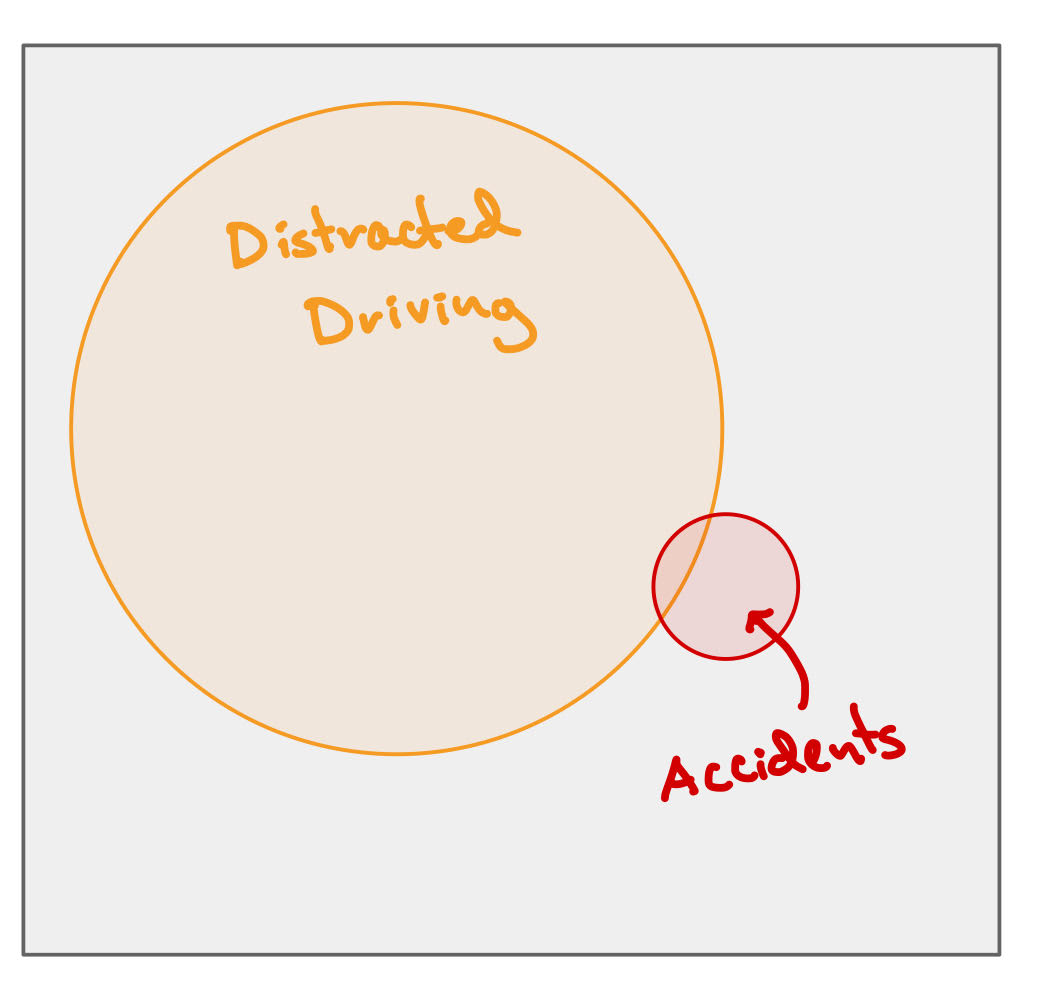 The gray box represents all instances of driving. The orange circle is the instances of distracted driving, the red is drives that result in accidents.
