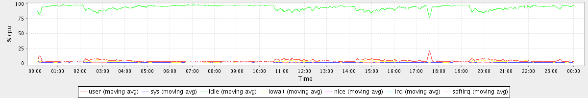 avg(user) = 3.55 avg(sys) = 0.69 avg(idle) = 93.92 avg(iowait) = 1.48 avg(nice) = 0.00 avg(irq) = 0.01 avg(softirq) = 0.34