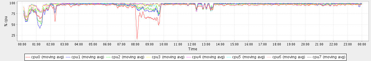 avg(cpu0) = 90.71 avg(cpu1) = 93.88 avg(cpu2) = 94.26 avg(cpu3) = 95.93 avg(cpu4) = 96.85 avg(cpu5) = 96.86 avg(cpu6) = 95.45 avg(cpu7) = 97.38