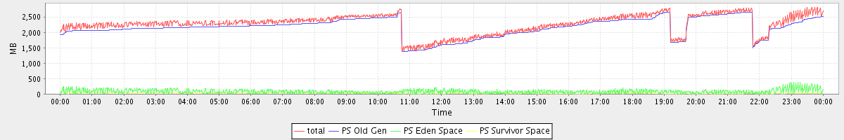 avg(total) = 2270.75 avg(PS Old Gen) = 2163.95 avg(PS Eden Space) = 85.21 avg(PS Survivor Space) = 21.59