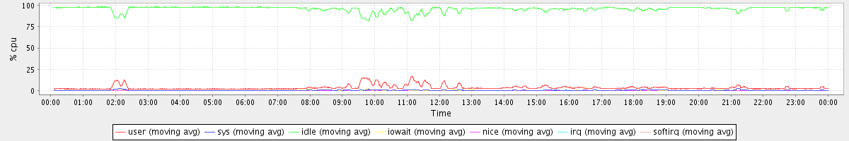 avg(user) = 3.39 avg(sys) = 0.35 avg(idle) = 95.93 avg(iowait) = 0.27 avg(nice) = 0.00 avg(irq) = 0.00 avg(softirq) = 0.05