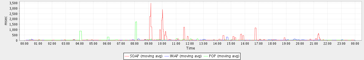 avg(ModifyContactRequest) = 7.80 avg(GetMsgRequest) = 10.19 avg(GetAccountRequest) = 1.00 avg(FlushCacheRequest) = 0.00 avg(ModifyTaskRequest) = 49.50 avg(DismissCalendarItemAlarmRequest) = 18.80 avg(GetAvailableCsvFormatsRequest) = 0.68 avg(ModifyAppointmentRequest) = 49.75 avg(GetMiniCalRequest) = 9.13 avg(CheckLicenseRequest) = 1.35 avg(SearchConvRequest) = 14.19 avg(ModifyIdentityRequest) = 5.50 avg(GetServerRequest) = 1.14 avg(GetAvailableSkinsRequest) = 0.10 avg(CreateFolderRequest) = 47.85 avg(SendInviteReplyRequest) = 1196.00 avg(SetAppointmentRequest) = 25.33 avg(SearchRequest) = 14.35 avg(GetFolderRequest) = 0.23 avg(GetCosRequest) = 0.00 avg(SendMsgRequest) = 169.73 avg(GetContactsRequest) = 2.72 avg(AutoCompleteGalRequest) = 1776.79 avg(GetMailboxRequest) = 0.50 avg(DeleteSignatureRequest) = 7.00 avg(CreateSearchFolderRequest) = 17.00 avg(GetAvailableLocalesRequest) = 14.15 avg(SaveRulesRequest) = 13.86 avg(GetAllCosRequest) = 3.00 avg(ImportAppointmentsRequest) = 4440.75 avg(CreateSignatureRequest) = 6.29 avg(GetDomainRequest) = 0.15 avg(GetAccountInfoRequest) = 0.29 avg(ItemActionRequest) = 9.67 avg(ConvActionRequest) = 15.89 avg(CreateTaskRequest) = 24.00 avg(NoOpRequest) = 0.03 avg(SearchGalRequest) = 22640.77 avg(SyncRequest) = 1.63 avg(CreateMountpointRequest) = 18.00 avg(ModifyPrefsRequest) = 6.70 avg(GetInfoRequest) = 9.79 avg(ModifyDomainRequest) = 4.50 avg(GetFreeBusyRequest) = 18.00 avg(GetRulesRequest) = 0.45 avg(EndSessionRequest) = 1.73 avg(BrowseRequest) = 19.00 avg(CreateTagRequest) = 15.20 avg(DelegateAuthRequest) = 0.10 avg(SyncGalRequest) = 207689.04 avg(FolderActionRequest) = 205.64 avg(AuthRequest) = 16.04 avg(ModifySignatureRequest) = 16.00 avg(ContactActionRequest) = 18.67 avg(BackupRequest) = 3225.00 avg(GetAppointmentRequest) = 1.14 avg(SaveDraftRequest) = 31.31 avg(TagActionRequest) = 21.00 avg(GetIdentitiesRequest) = 1.00 avg(CreateAppointmentRequest) = 50.29 avg(CheckSpellingRequest) = 65.78 avg(SearchCalendarResourcesRequest) = 0.75 avg(CancelAppointmentRequest) = 23.50 avg(ReIndexRequest) = 55.33 avg(CreateContactRequest) = 9.50 avg(AddMsgRequest) = 20.65 avg(MsgActionRequest) = 14.89 avg(GetDomainInfoRequest) = 0.70