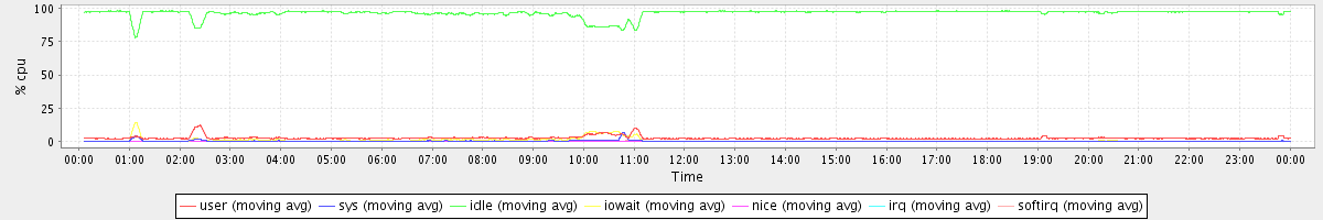 avg(user) = 2.44 avg(sys) = 0.32 avg(idle) = 96.48 avg(iowait) = 0.70 avg(nice) = 0.00 avg(irq) = 0.00 avg(softirq) = 0.03