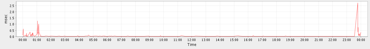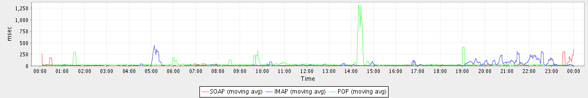 avg(GetMsgRequest) = 10.71 avg(ModifyPrefsRequest) = 7.67 avg(GetAccountRequest) = 1.00 avg(GetInfoRequest) = 5.66 avg(GetAvailableCsvFormatsRequest) = 3.20 avg(GetFreeBusyRequest) = 55.33 avg(GetMiniCalRequest) = 13.72 avg(GetRulesRequest) = 1.29 avg(EndSessionRequest) = 2.32 avg(CheckLicenseRequest) = 1.51 avg(SearchConvRequest) = 15.63 avg(CreateFolderRequest) = 10.57 avg(GetAvailableSkinsRequest) = 0.17 avg(SyncGalRequest) = 116202.90 avg(FolderActionRequest) = 204.50 avg(AuthRequest) = 8.47 avg(SendInviteReplyRequest) = 85.00 avg(GetFolderRequest) = 0.44 avg(SearchRequest) = 11.29 avg(BackupRequest) = 3128.50 avg(SendMsgRequest) = 59.07 avg(SaveDraftRequest) = 19.09 avg(AutoCompleteGalRequest) = 126.33 avg(GetContactsRequest) = 5.71 avg(GetSignaturesRequest) = 1.00 avg(CreateAppointmentRequest) = 64.18 avg(CheckSpellingRequest) = 84.33 avg(SearchCalendarResourcesRequest) = 1.50 avg(GetAvailableLocalesRequest) = 94.20 avg(SaveRulesRequest) = 6.00 avg(CreateSignatureRequest) = 5.00 avg(ConvActionRequest) = 15.88 avg(MsgActionRequest) = 13.35 avg(NoOpRequest) = 0.10 avg(GetDomainInfoRequest) = 0.78 avg(SyncRequest) = 0.23 avg(SearchGalRequest) = 2277.73