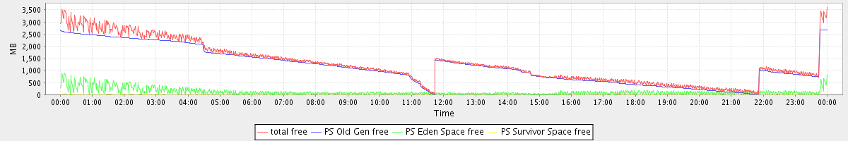 avg(total free) = 1273.84 avg(PS Old Gen free) = 1156.38 avg(PS Eden Space free) = 112.76 avg(PS Survivor Space free) = 4.69