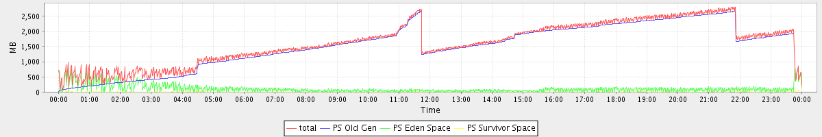 avg(total) = 1624.91 avg(PS Old Gen) = 1513.96 avg(PS Eden Space) = 105.51 avg(PS Survivor Space) = 5.44