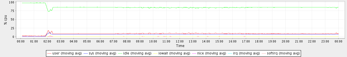 avg(user) = 8.27 avg(sys) = 5.94 avg(idle) = 85.63 avg(iowait) = 0.13 avg(nice) = 0.00 avg(irq) = 0.00 avg(softirq) = 0.01