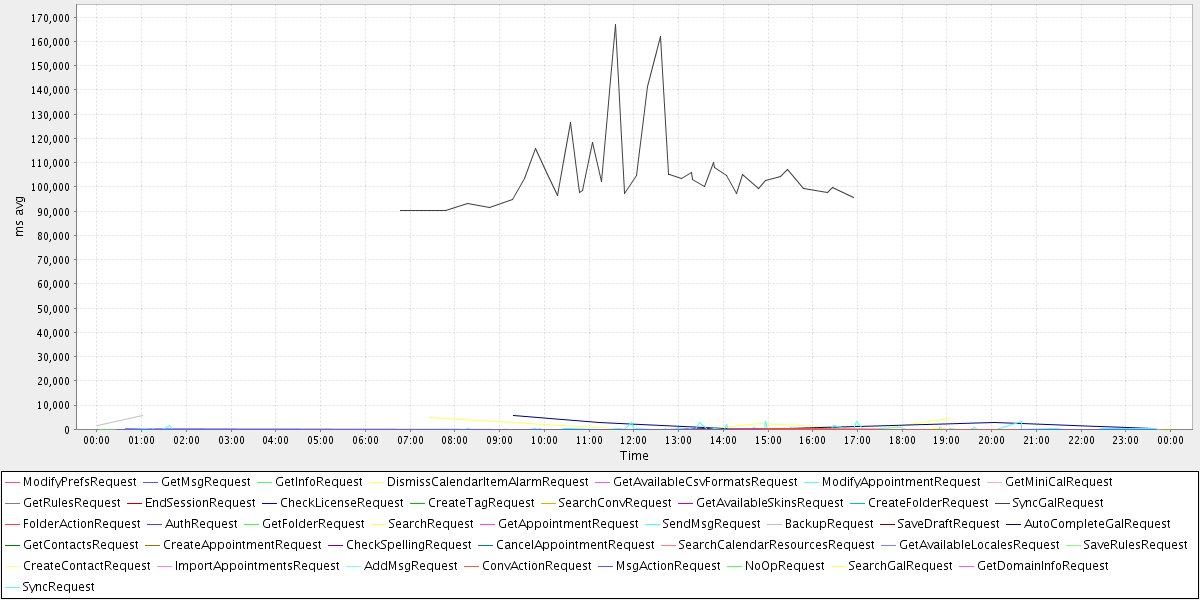 avg(ModifyPrefsRequest) = 6.00 avg(GetMsgRequest) = 8.86 avg(GetInfoRequest) = 4.12 avg(DismissCalendarItemAlarmRequest) = 13.00 avg(GetAvailableCsvFormatsRequest) = 1.56 avg(ModifyAppointmentRequest) = 40.00 avg(GetMiniCalRequest) = 49.17 avg(GetRulesRequest) = 0.52 avg(EndSessionRequest) = 2.52 avg(CheckLicenseRequest) = 1.17 avg(CreateTagRequest) = 11.00 avg(SearchConvRequest) = 13.10 avg(GetAvailableSkinsRequest) = 0.11 avg(CreateFolderRequest) = 9.62 avg(SyncGalRequest) = 105996.55 avg(FolderActionRequest) = 95.00 avg(AuthRequest) = 14.33 avg(GetFolderRequest) = 0.09 avg(SearchRequest) = 14.34 avg(GetAppointmentRequest) = 20.00 avg(SendMsgRequest) = 244.91 avg(BackupRequest) = 3558.50 avg(SaveDraftRequest) = 38.25 avg(AutoCompleteGalRequest) = 1886.67 avg(GetContactsRequest) = 6.35 avg(CreateAppointmentRequest) = 35.20 avg(CheckSpellingRequest) = 259.00 avg(CancelAppointmentRequest) = 51.50 avg(SearchCalendarResourcesRequest) = 0.50 avg(GetAvailableLocalesRequest) = 35.00 avg(SaveRulesRequest) = 6.10 avg(CreateContactRequest) = 10.25 avg(ImportAppointmentsRequest) = 1064.00 avg(AddMsgRequest) = 24.78 avg(ConvActionRequest) = 18.28 avg(MsgActionRequest) = 13.26 avg(NoOpRequest) = 0.06 avg(SearchGalRequest) = 1723.29 avg(GetDomainInfoRequest) = 0.65 avg(SyncRequest) = 1.20