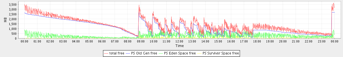 avg(total free) = 1368.28 avg(PS Old Gen free) = 1068.23 avg(PS Eden Space free) = 262.67 avg(PS Survivor Space free) = 37.38