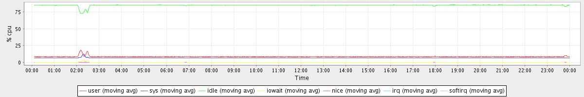 avg(user) = 8.41 avg(sys) = 6.37 avg(idle) = 85.12 avg(iowait) = 0.08 avg(nice) = 0.00 avg(irq) = 0.00 avg(softirq) = 0.00
