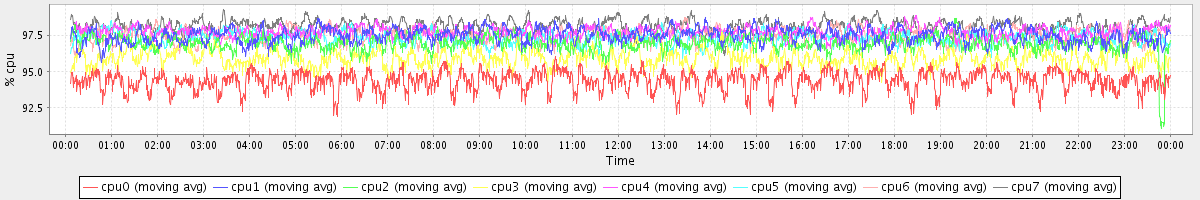 avg(cpu0) = 94.36 avg(cpu1) = 97.47 avg(cpu2) = 96.92 avg(cpu3) = 95.92 avg(cpu4) = 97.71 avg(cpu5) = 97.32 avg(cpu6) = 97.48 avg(cpu7) = 98.12
