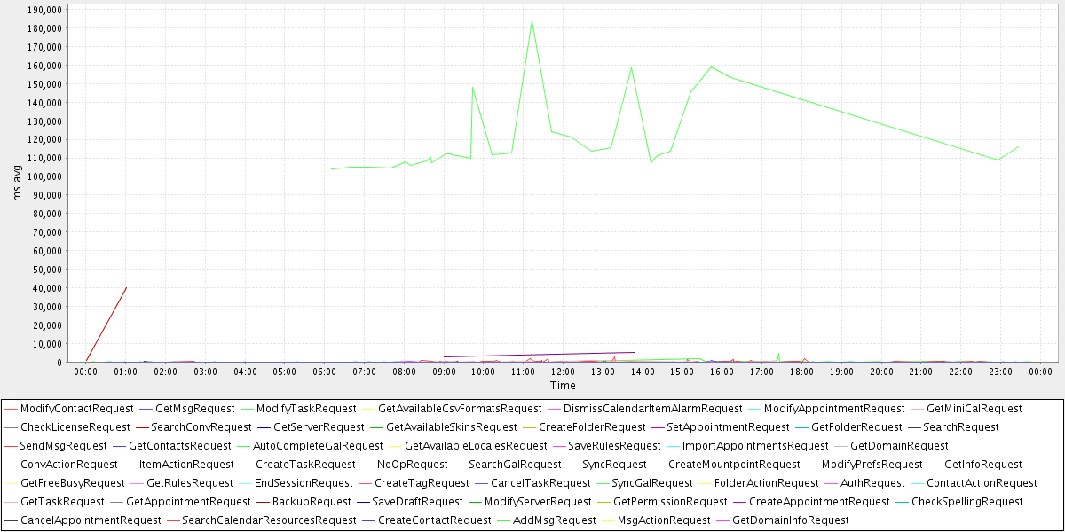 avg(ModifyContactRequest) = 9.50 avg(GetMsgRequest) = 12.29 avg(ModifyTaskRequest) = 62.00 avg(GetAvailableCsvFormatsRequest) = 0.00 avg(DismissCalendarItemAlarmRequest) = 17.33 avg(ModifyAppointmentRequest) = 64.00 avg(GetMiniCalRequest) = 166.48 avg(CheckLicenseRequest) = 1.05 avg(SearchConvRequest) = 12.64 avg(GetServerRequest) = 43.00 avg(GetAvailableSkinsRequest) = 0.17 avg(CreateFolderRequest) = 14.50 avg(SetAppointmentRequest) = 63.00 avg(GetFolderRequest) = 1.64 avg(SearchRequest) = 17.21 avg(SendMsgRequest) = 237.35 avg(GetContactsRequest) = 7.16 avg(AutoCompleteGalRequest) = 765.20 avg(GetAvailableLocalesRequest) = 3.33 avg(SaveRulesRequest) = 47.00 avg(ImportAppointmentsRequest) = 2135.00 avg(GetDomainRequest) = 22.00 avg(ConvActionRequest) = 13.80 avg(ItemActionRequest) = 28.70 avg(CreateTaskRequest) = 24.50 avg(NoOpRequest) = 0.07 avg(SearchGalRequest) = 3820.00 avg(SyncRequest) = 0.54 avg(CreateMountpointRequest) = 62.00 avg(ModifyPrefsRequest) = 46.50 avg(GetInfoRequest) = 36.71 avg(GetFreeBusyRequest) = 215.67 avg(GetRulesRequest) = 0.44 avg(EndSessionRequest) = 3.08 avg(CreateTagRequest) = 12.80 avg(CancelTaskRequest) = 72.50 avg(SyncGalRequest) = 120267.20 avg(FolderActionRequest) = 46.86 avg(AuthRequest) = 11.46 avg(ContactActionRequest) = 15.00 avg(GetTaskRequest) = 17.00 avg(GetAppointmentRequest) = 15.00 avg(BackupRequest) = 20638.00 avg(SaveDraftRequest) = 42.75 avg(ModifyServerRequest) = 47.00 avg(GetPermissionRequest) = 0.33 avg(CreateAppointmentRequest) = 33.00 avg(CheckSpellingRequest) = 57.50 avg(CancelAppointmentRequest) = 58.50 avg(SearchCalendarResourcesRequest) = 43.67 avg(CreateContactRequest) = 7.00 avg(AddMsgRequest) = 23.67 avg(MsgActionRequest) = 13.58 avg(GetDomainInfoRequest) = 121.42