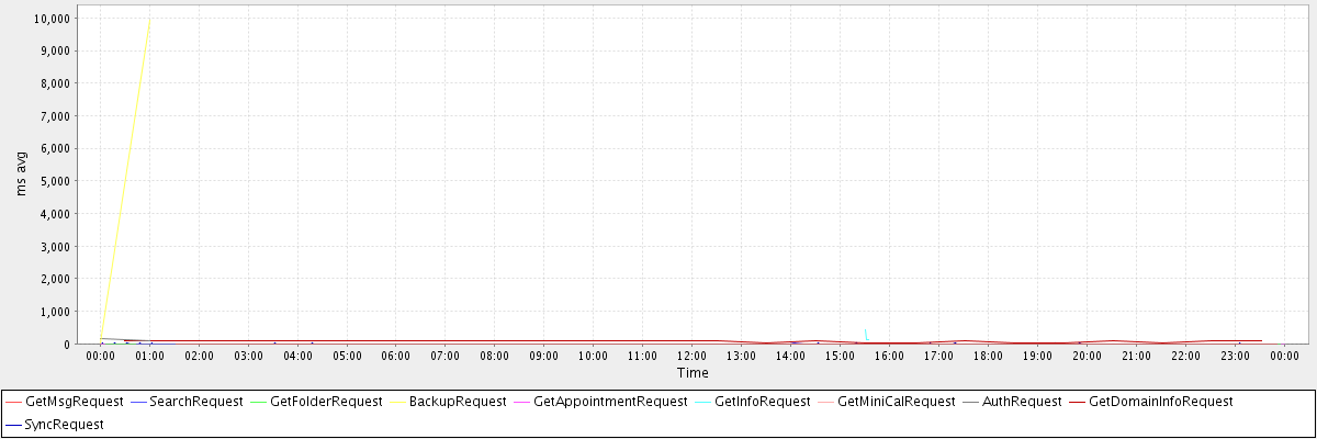 avg(GetMsgRequest) = 0.07 avg(SearchRequest) = 5.54 avg(GetFolderRequest) = 0.13 avg(BackupRequest) = 4966.50 avg(GetAppointmentRequest) = 1.06 avg(GetInfoRequest) = 197.40 avg(GetMiniCalRequest) = 4.97 avg(AuthRequest) = 118.00 avg(GetDomainInfoRequest) = 76.04 avg(SyncRequest) = 0.86
