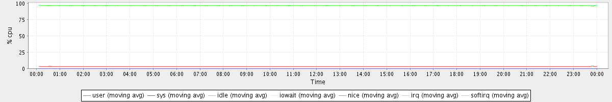 avg(user) = 2.86 avg(sys) = 0.17 avg(idle) = 96.97 avg(iowait) = 0.00 avg(nice) = 0.00 avg(irq) = 0.00 avg(softirq) = 0.00