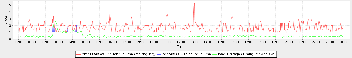 avg(processes waiting for run time) = 0.38 avg(processes waiting for io time) = 0.07 avg(load average (1 min)) = 0.45