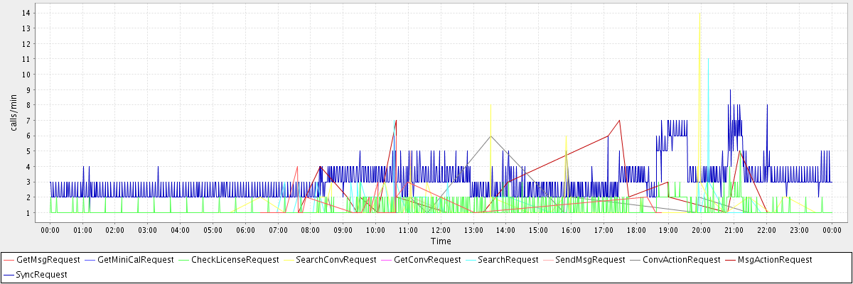 max(GetMsgRequest) = 6.00 max(GetMiniCalRequest) = 6.00 max(CheckLicenseRequest) = 5.00 max(SearchConvRequest) = 14.00 max(GetConvRequest) = 10.00 max(SearchRequest) = 11.00 max(SendMsgRequest) = 5.00 max(ConvActionRequest) = 6.00 max(MsgActionRequest) = 7.00 max(SyncRequest) = 9.00