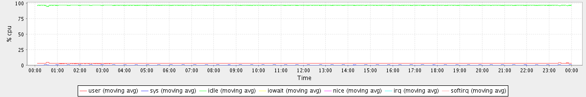 avg(user) = 2.86 avg(sys) = 0.24 avg(idle) = 96.88 avg(iowait) = 0.00 avg(nice) = 0.00 avg(irq) = 0.00 avg(softirq) = 0.00
