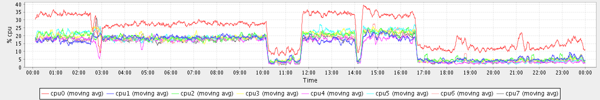 avg(cpu0) = 2.70 avg(cpu1) = 1.64 avg(cpu2) = 1.49 avg(cpu3) = 1.09 avg(cpu4) = 0.99 avg(cpu5) = 0.95 avg(cpu6) = 1.04 avg(cpu7) = 0.72