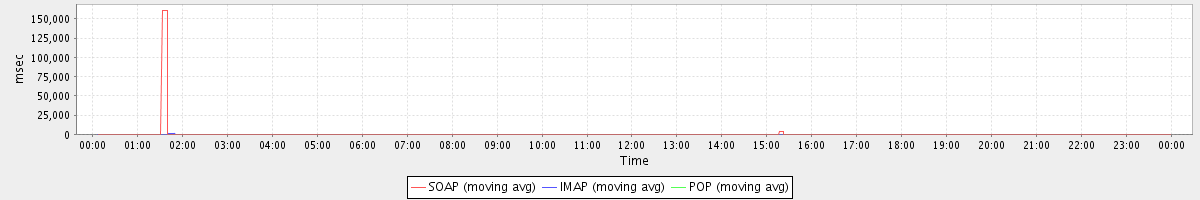 avg(CreateMountpointRequest) = 68.20 avg(ModifyContactRequest) = 30.33 avg(ModifyPrefsRequest) = 54.00 avg(GetMsgRequest) = 19.00 avg(GetInfoRequest) = 63.84 avg(GetAvailableCsvFormatsRequest) = 15.00 avg(GetMiniCalRequest) = 117.62 avg(GetItemRequest) = 0.75 avg(GetRulesRequest) = 0.11 avg(EndSessionRequest) = 2.11 avg(CheckLicenseRequest) = 1.04 avg(SearchConvRequest) = 27.00 avg(DelegateAuthRequest) = 0.00 avg(CreateFolderRequest) = 12228.00 avg(GetAvailableSkinsRequest) = 0.00 avg(SyncGalRequest) = 111285.27 avg(FolderActionRequest) = 1498.53 avg(AuthRequest) = 7.22 avg(SetAppointmentRequest) = 59.50 avg(SearchRequest) = 42.36 avg(GetFolderRequest) = 1.21 avg(GetAppointmentRequest) = 29.25 avg(BackupRequest) = 968610.50 avg(SendMsgRequest) = 385.45 avg(SaveDraftRequest) = 55.67 avg(AutoCompleteGalRequest) = 1351.67 avg(GetContactsRequest) = 12.52 avg(CreateAppointmentRequest) = 122.00 avg(GetPermissionRequest) = 0.00 avg(CheckSpellingRequest) = 570.00 avg(SearchCalendarResourcesRequest) = 55.00 avg(GetAvailableLocalesRequest) = 121.67 avg(SaveRulesRequest) = 49.64 avg(GetWikiRequest) = 0.00 avg(AddMsgRequest) = 44.48 avg(GetAccountInfoRequest) = 0.00 avg(ConvActionRequest) = 20.33 avg(MsgActionRequest) = 18.95 avg(CreateTaskRequest) = 283.00 avg(NoOpRequest) = 0.06 avg(SaveWikiRequest) = 82.50 avg(SyncRequest) = 0.59 avg(GetDomainInfoRequest) = 123.70 avg(SearchGalRequest) = 3563.00