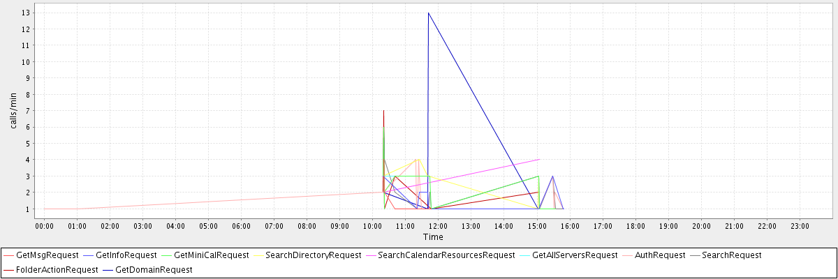 max(GetMsgRequest) = 4.00 max(GetInfoRequest) = 3.00 max(GetMiniCalRequest) = 6.00 max(SearchDirectoryRequest) = 4.00 max(SearchCalendarResourcesRequest) = 4.00 max(GetAllServersRequest) = 3.00 max(AuthRequest) = 4.00 max(SearchRequest) = 6.00 max(FolderActionRequest) = 7.00 max(GetDomainRequest) = 13.00
