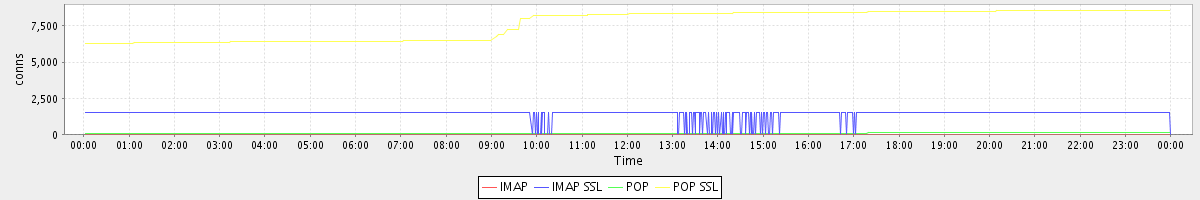 avg(IMAP) = 0.70 avg(IMAP SSL) = 1078.02 avg(POP) = 59.94 avg(POP SSL) = 5346.31