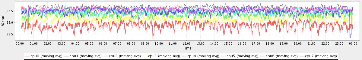 avg(cpu0) = 94.38 avg(cpu1) = 97.34 avg(cpu2) = 96.78 avg(cpu3) = 95.90 avg(cpu4) = 97.68 avg(cpu5) = 97.30 avg(cpu6) = 97.61 avg(cpu7) = 98.11