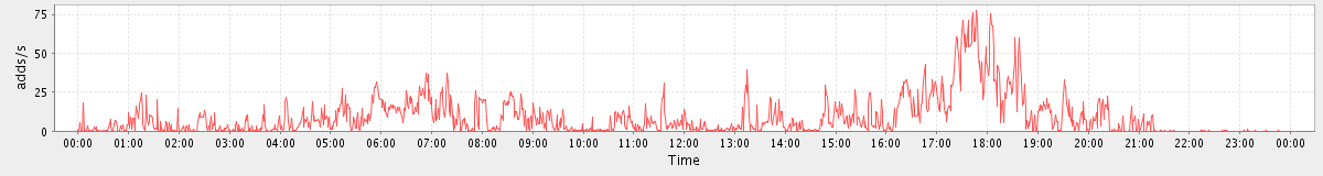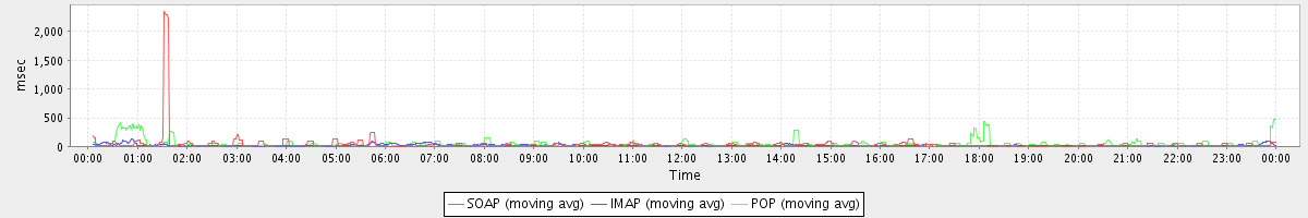max(GetMsgRequest) = 40.00 max(SearchConvRequest) = 32.00 max(SearchRequest) = 45.00 max(GetFolderRequest) = 183.00 max(ConvActionRequest) = 23.00 max(NoOpRequest) = 638.00 max(GetInfoRequest) = 14.00 max(AuthRequest) = 14.00 max(GetAppointmentRequest) = 32.00 max(MsgActionRequest) = 105.00