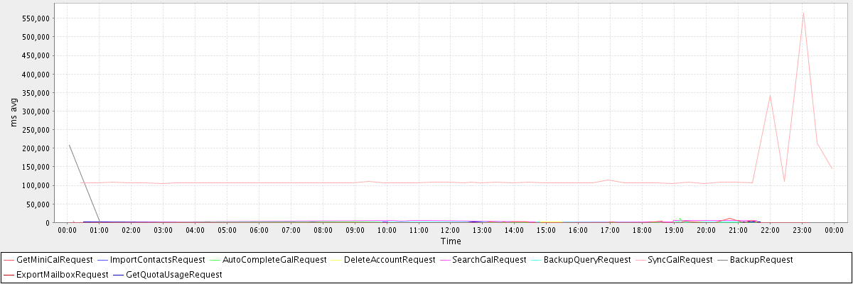 avg(GetMiniCalRequest) = 593.09 avg(ImportContactsRequest) = 1221.33 avg(AutoCompleteGalRequest) = 800.83 avg(DeleteAccountRequest) = 1841.75 avg(SearchGalRequest) = 3937.12 avg(BackupQueryRequest) = 1153.86 avg(SyncGalRequest) = 124442.55 avg(BackupRequest) = 105603.50 avg(ExportMailboxRequest) = 1788.00 avg(GetQuotaUsageRequest) = 1164.00