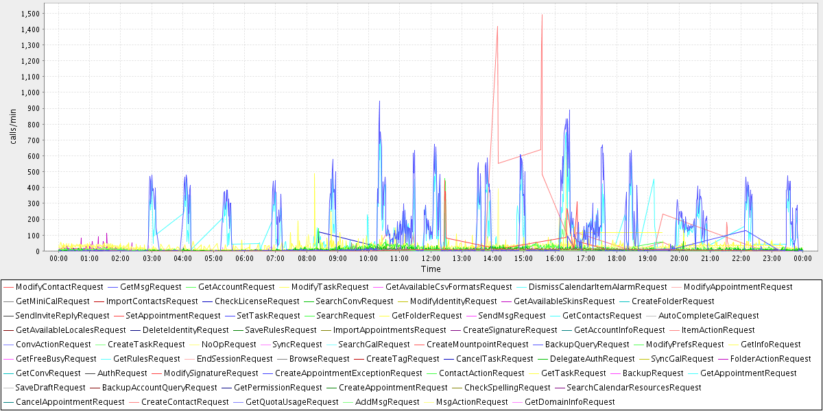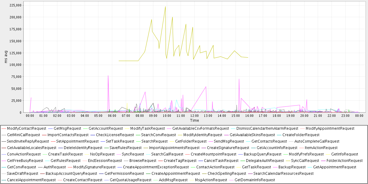 avg(ModifyContactRequest) = 4.00 avg(GetMsgRequest) = 108.03 avg(GetAccountRequest) = 7.61 avg(ModifyTaskRequest) = 1.60 avg(GetAvailableCsvFormatsRequest) = 1.07 avg(DismissCalendarItemAlarmRequest) = 1.00 avg(ModifyAppointmentRequest) = 1.21 avg(GetMiniCalRequest) = 3.47 avg(ImportContactsRequest) = 1.00 avg(CheckLicenseRequest) = 1.52 avg(SearchConvRequest) = 7.81 avg(ModifyIdentityRequest) = 1.00 avg(GetAvailableSkinsRequest) = 1.13 avg(CreateFolderRequest) = 1.77 avg(SendInviteReplyRequest) = 1.62 avg(SetAppointmentRequest) = 107.39 avg(SetTaskRequest) = 43.67 avg(SearchRequest) = 14.46 avg(GetFolderRequest) = 22.07 avg(SendMsgRequest) = 1.88 avg(GetContactsRequest) = 2.88 avg(AutoCompleteGalRequest) = 2.39 avg(GetAvailableLocalesRequest) = 1.07 avg(DeleteIdentityRequest) = 2.00 avg(SaveRulesRequest) = 1.92 avg(ImportAppointmentsRequest) = 1.00 avg(CreateSignatureRequest) = 1.00 avg(GetAccountInfoRequest) = 1.00 avg(ItemActionRequest) = 251.52 avg(ConvActionRequest) = 3.30 avg(CreateTaskRequest) = 1.22 avg(NoOpRequest) = 22.48 avg(SyncRequest) = 4.25 avg(SearchGalRequest) = 1.50 avg(CreateMountpointRequest) = 4.16 avg(BackupQueryRequest) = 1.00 avg(ModifyPrefsRequest) = 1.06 avg(GetInfoRequest) = 7.46 avg(GetFreeBusyRequest) = 1.94 avg(GetRulesRequest) = 1.19 avg(EndSessionRequest) = 1.89 avg(BrowseRequest) = 1.00 avg(CreateTagRequest) = 2.00 avg(CancelTaskRequest) = 27.71 avg(DelegateAuthRequest) = 1.00 avg(SyncGalRequest) = 1.00 avg(FolderActionRequest) = 7.24 avg(GetConvRequest) = 2.00 avg(AuthRequest) = 3.81 avg(ModifySignatureRequest) = 1.00 avg(CreateAppointmentExceptionRequest) = 1.67 avg(ContactActionRequest) = 10.00 avg(GetTaskRequest) = 115.00 avg(BackupRequest) = 1.00 avg(GetAppointmentRequest) = 130.03 avg(SaveDraftRequest) = 1.43 avg(BackupAccountQueryRequest) = 2.00 avg(GetPermissionRequest) = 1.03 avg(CreateAppointmentRequest) = 1.16 avg(CheckSpellingRequest) = 1.15 avg(SearchCalendarResourcesRequest) = 2.47 avg(CancelAppointmentRequest) = 1.34 avg(CreateContactRequest) = 17.83 avg(GetQuotaUsageRequest) = 1.00 avg(AddMsgRequest) = 26.45 avg(MsgActionRequest) = 5.10 avg(GetDomainInfoRequest) = 2.67