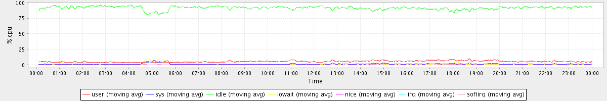 avg(user) = 5.35 avg(sys) = 1.19 avg(idle) = 91.53 avg(iowait) = 1.68 avg(nice) = 0.00 avg(irq) = 0.01 avg(softirq) = 0.22
