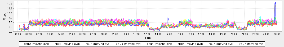 avg(cpu0) = 0.19 avg(cpu1) = 13.17 avg(cpu2) = 7.73 avg(cpu3) = 1.18 avg(cpu4) = 1.44 avg(cpu5) = 19.96 avg(cpu6) = 0.54 avg(cpu7) = 13.25