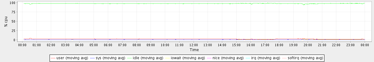avg(user) = 2.24 avg(sys) = 0.23 avg(idle) = 97.31 avg(iowait) = 0.19 avg(nice) = 0.00 avg(irq) = 0.00 avg(softirq) = 0.00