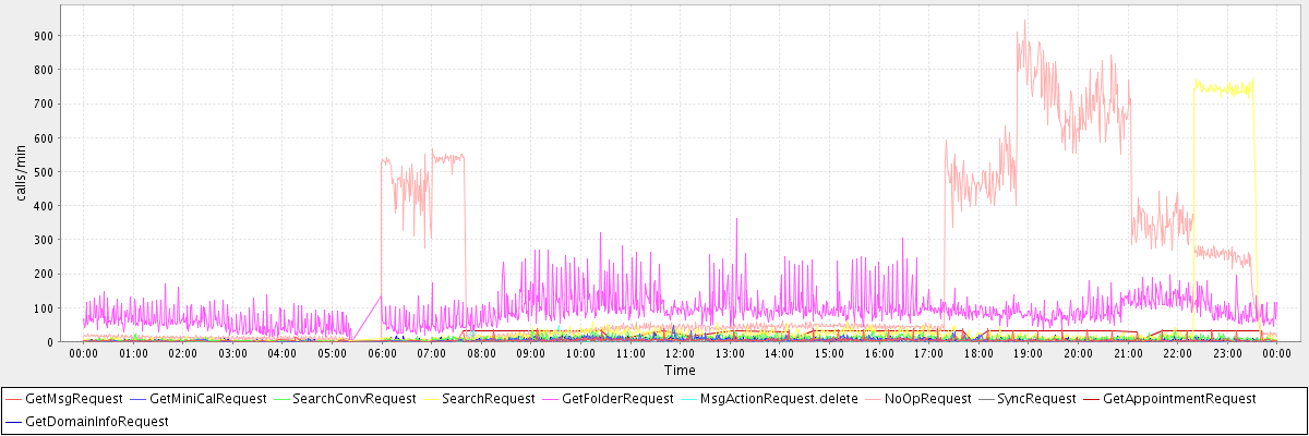max(GetMsgRequest) = 39.00 max(GetMiniCalRequest) = 48.00 max(SearchConvRequest) = 34.00 max(SearchRequest) = 774.00 max(GetFolderRequest) = 363.00 max(MsgActionRequest.delete) = 49.00 max(NoOpRequest) = 945.00 max(SyncRequest) = 47.00 max(GetAppointmentRequest) = 32.00 max(GetDomainInfoRequest) = 24.00