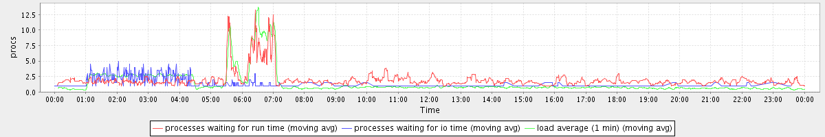 avg(processes waiting for run time) = 1.10 avg(processes waiting for io time) = 0.35 avg(load average (1 min)) = 1.41