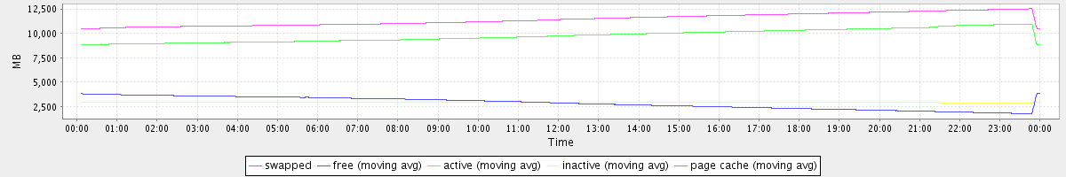 avg(swapped) = 0.00 avg(free) = 2864.56 avg(active) = 9769.63 avg(inactive) = 2981.62 avg(page cache) = 11430.45