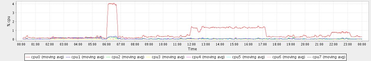 avg(cpu0) = 0.61 avg(cpu1) = 0.06 avg(cpu2) = 0.06 avg(cpu3) = 0.01 avg(cpu4) = 0.02 avg(cpu5) = 0.01 avg(cpu6) = 0.04 avg(cpu7) = 0.01