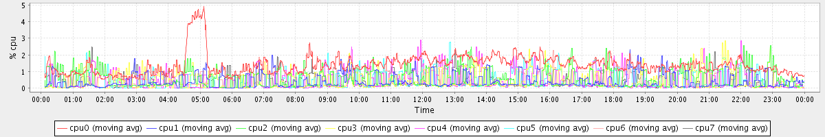 avg(cpu0) = 1.40 avg(cpu1) = 0.42 avg(cpu2) = 0.60 avg(cpu3) = 0.50 avg(cpu4) = 0.51 avg(cpu5) = 0.35 avg(cpu6) = 0.33 avg(cpu7) = 0.35