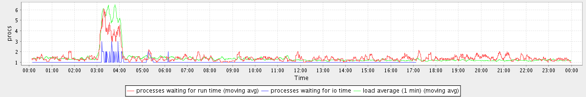 avg(processes waiting for run time) = 1.46 avg(processes waiting for io time) = 0.07 avg(load average (1 min)) = 1.45