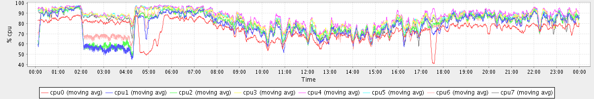 avg(cpu0) = 73.96 avg(cpu1) = 77.59 avg(cpu2) = 79.31 avg(cpu3) = 84.52 avg(cpu4) = 86.82 avg(cpu5) = 84.75 avg(cpu6) = 79.50 avg(cpu7) = 83.16