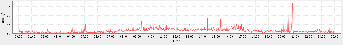 avg(FolderActionRequest.sync) = 1.00 avg(ConvActionRequest.!read) = 1.15 avg(ModifyTaskRequest) = 1.00 avg(MsgActionRequest.move) = 5.14 avg(ModifyAppointmentRequest) = 1.17 avg(GetMiniCalRequest) = 3.92 avg(ConvActionRequest.!flag) = 1.12 avg(ModifyIdentityRequest) = 1.00 avg(CreateFolderRequest) = 1.18 avg(FolderActionRequest.trash) = 1.00 avg(SearchRequest) = 18.40 avg(SendMsgRequest) = 2.40 avg(GetContactsRequest) = 3.10 avg(AutoCompleteGalRequest) = 2.74 avg(ImportAppointmentsRequest) = 1.00 avg(DeleteAccountRequest) = 1.00 avg(MsgActionRequest.delete) = 11.60 avg(NoOpRequest) = 30.20 avg(CreateMountpointRequest) = 1.00 avg(BackupQueryRequest) = 1.00 avg(ICalReplyRequest) = 1.00 avg(GetInfoRequest) = 6.41 avg(MsgActionRequest.trash) = 1.25 avg(ConvActionRequest.trash) = 3.49 avg(GetFreeBusyRequest) = 1.69 avg(MsgActionRequest.!flag) = 1.00 avg(GetRulesRequest) = 1.08 avg(EndSessionRequest) = 2.08 avg(ConvActionRequest.!spam) = 1.00 avg(BrowseRequest) = 1.00 avg(CancelTaskRequest) = 4.00 avg(CreateTagRequest) = 1.00 avg(SyncGalRequest) = 1.04 avg(MsgActionRequest.update) = 2.25 avg(CreateAppointmentExceptionRequest) = 1.00 avg(GetTaskRequest) = 1.00 avg(SaveDraftRequest) = 1.72 avg(GetIdentitiesRequest) = 1.00 avg(CheckSpellingRequest) = 1.04 avg(CancelAppointmentRequest) = 2.18 avg(MsgActionRequest.flag) = 1.21 avg(AddMsgRequest) = 1.19 avg(GetDomainInfoRequest) = 7.58 avg(ModifyContactRequest) = 1.00 avg(GetMsgRequest) = 4.65 avg(MsgActionRequest.read) = 1.62 avg(GetAccountRequest) = 1.00 avg(FolderActionRequest.delete) = 2.69 avg(GetAvailableCsvFormatsRequest) = 1.03 avg(DismissCalendarItemAlarmRequest) = 1.16 avg(ConvActionRequest.read) = 1.08 avg(MsgActionRequest.tag) = 1.00 avg(FolderActionRequest.color) = 1.50 avg(FolderActionRequest.!check) = 1.63 avg(CheckLicenseRequest) = 3.30 avg(SearchConvRequest) = 10.17 avg(FolderActionRequest.read) = 1.25 avg(GetAvailableSkinsRequest) = 1.07 avg(MsgActionRequest.!spam) = 1.00 avg(SendInviteReplyRequest) = 1.25 avg(SetAppointmentRequest) = 1.16 avg(GetTagRequest) = 1.00 avg(SetTaskRequest) = 1.25 avg(GetFolderRequest) = 14.10 avg(ContactActionRequest.delete) = 3.00 avg(ItemActionRequest.delete) = 6.00 avg(ConvActionRequest.tag) = 1.08 avg(GetAvailableLocalesRequest) = 1.03 avg(SaveRulesRequest) = 1.17 avg(GetAccountInfoRequest) = 1.00 avg(ConvActionRequest.delete) = 2.24 avg(CreateTaskRequest) = 1.08 avg(SyncRequest) = 11.63 avg(SearchGalRequest) = 1.41 avg(ConvActionRequest.move) = 1.67 avg(ModifyPrefsRequest) = 1.05 avg(MsgActionRequest.!read) = 1.07 avg(FolderActionRequest.move) = 1.00 avg(FolderActionRequest.empty) = 1.25 avg(FolderActionRequest.grant) = 1.00 avg(DelegateAuthRequest) = 1.00 avg(AuthRequest) = 4.72 avg(GetConvRequest) = 4.00 avg(ModifySignatureRequest) = 1.00 avg(ConvActionRequest.spam) = 1.40 avg(BackupRequest) = 1.00 avg(GetAppointmentRequest) = 1.69 avg(ContactActionRequest.move) = 1.50 avg(ConvActionRequest.flag) = 1.17 avg(CreateAppointmentRequest) = 1.07 avg(GetPermissionRequest) = 1.00 avg(SearchCalendarResourcesRequest) = 2.16 avg(GetQuotaUsageRequest) = 1.00 avg(CreateContactRequest) = 1.09 avg(FolderActionRequest.check) = 1.61 avg(FolderActionRequest.rename) = 1.36 avg(MsgActionRequest.spam) = 1.00 avg(ItemActionRequest.move) = 1.00