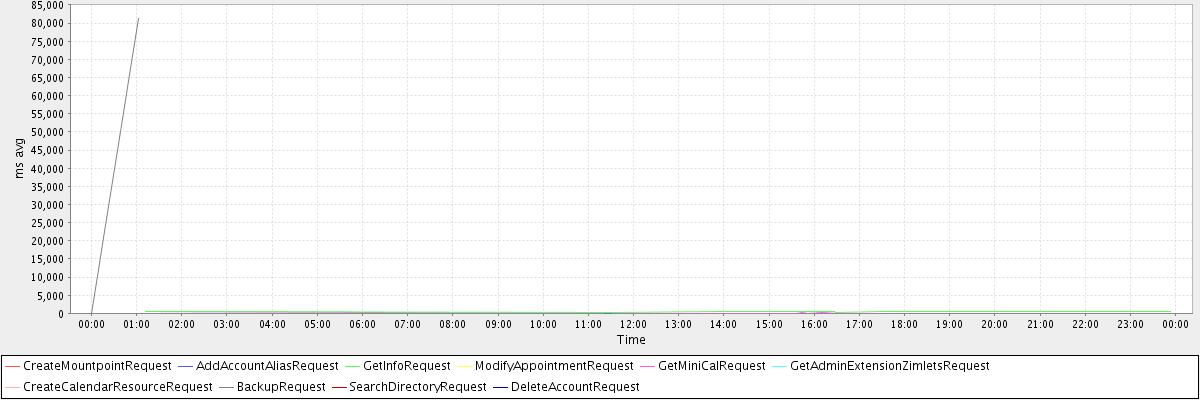 avg(CreateMountpointRequest) = 150.00 avg(AddAccountAliasRequest) = 58.62 avg(GetInfoRequest) = 231.00 avg(ModifyAppointmentRequest) = 115.00 avg(GetMiniCalRequest) = 76.74 avg(GetAdminExtensionZimletsRequest) = 61.00 avg(CreateCalendarResourceRequest) = 70.00 avg(BackupRequest) = 40612.00 avg(SearchDirectoryRequest) = 80.50 avg(DeleteAccountRequest) = 288.43