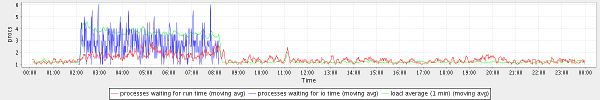 avg(processes waiting for run time) = 1.42 avg(processes waiting for io time) = 0.53 avg(load average (1 min)) = 1.82