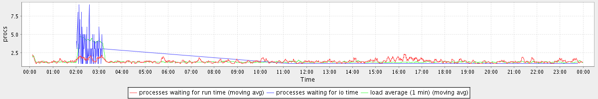 avg(processes waiting for run time) = 1.33 avg(processes waiting for io time) = 0.13 avg(load average (1 min)) = 1.35