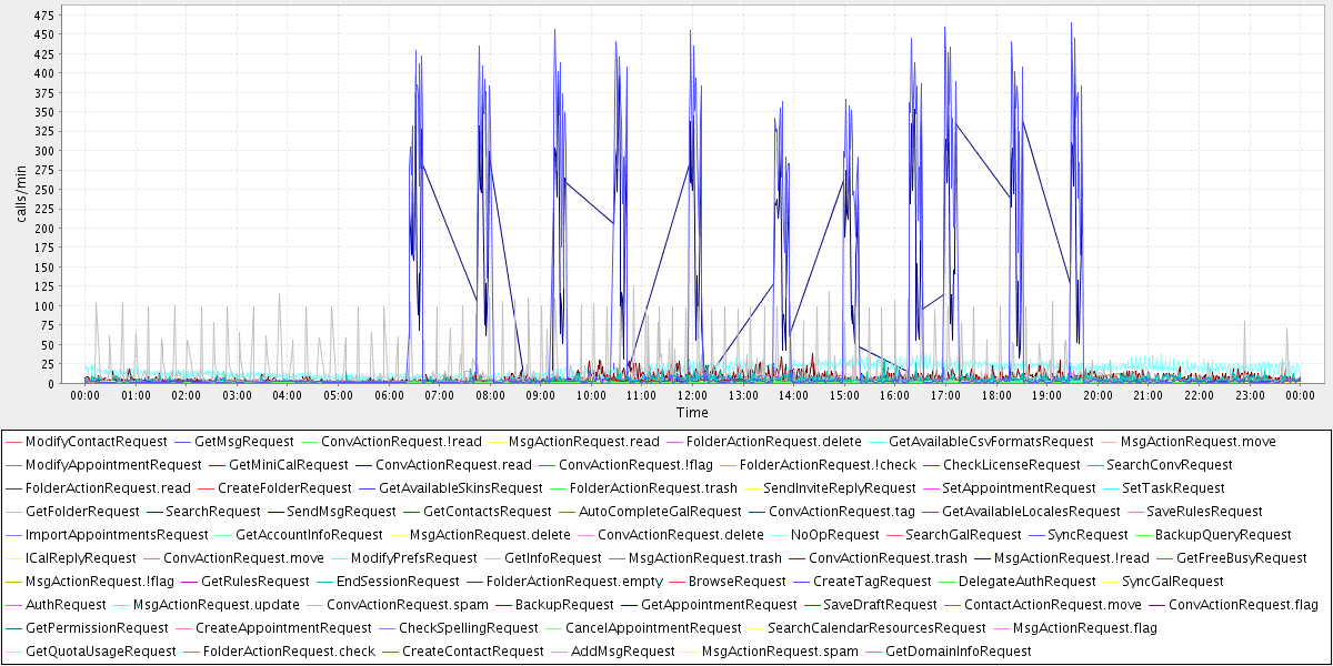 avg(ModifyContactRequest) = 1.00 avg(GetMsgRequest) = 74.05 avg(ConvActionRequest.!read) = 1.00 avg(MsgActionRequest.read) = 1.55 avg(FolderActionRequest.delete) = 1.00 avg(GetAvailableCsvFormatsRequest) = 1.11 avg(MsgActionRequest.move) = 2.43 avg(ModifyAppointmentRequest) = 1.00 avg(GetMiniCalRequest) = 1.74 avg(ConvActionRequest.read) = 1.40 avg(ConvActionRequest.!flag) = 1.38 avg(FolderActionRequest.!check) = 2.00 avg(CheckLicenseRequest) = 1.36 avg(SearchConvRequest) = 4.69 avg(FolderActionRequest.read) = 1.00 avg(CreateFolderRequest) = 1.00 avg(GetAvailableSkinsRequest) = 1.08 avg(FolderActionRequest.trash) = 1.00 avg(SendInviteReplyRequest) = 2.12 avg(SetAppointmentRequest) = 1.00 avg(SetTaskRequest) = 32.00 avg(GetFolderRequest) = 13.94 avg(SearchRequest) = 7.60 avg(SendMsgRequest) = 1.41 avg(GetContactsRequest) = 2.08 avg(AutoCompleteGalRequest) = 4.17 avg(ConvActionRequest.tag) = 1.00 avg(GetAvailableLocalesRequest) = 1.11 avg(SaveRulesRequest) = 1.00 avg(ImportAppointmentsRequest) = 4.00 avg(GetAccountInfoRequest) = 1.00 avg(MsgActionRequest.delete) = 1.15 avg(ConvActionRequest.delete) = 4.20 avg(NoOpRequest) = 16.80 avg(SearchGalRequest) = 1.42 avg(SyncRequest) = 4.16 avg(BackupQueryRequest) = 1.00 avg(ICalReplyRequest) = 2.80 avg(ConvActionRequest.move) = 1.36 avg(ModifyPrefsRequest) = 1.00 avg(GetInfoRequest) = 3.37 avg(MsgActionRequest.trash) = 1.15 avg(ConvActionRequest.trash) = 2.10 avg(MsgActionRequest.!read) = 1.00 avg(GetFreeBusyRequest) = 1.17 avg(MsgActionRequest.!flag) = 1.00 avg(GetRulesRequest) = 1.04 avg(EndSessionRequest) = 1.55 avg(FolderActionRequest.empty) = 1.17 avg(BrowseRequest) = 1.00 avg(CreateTagRequest) = 1.00 avg(DelegateAuthRequest) = 1.00 avg(SyncGalRequest) = 1.00 avg(AuthRequest) = 2.93 avg(MsgActionRequest.update) = 1.52 avg(ConvActionRequest.spam) = 1.09 avg(BackupRequest) = 1.00 avg(GetAppointmentRequest) = 196.27 avg(SaveDraftRequest) = 1.28 avg(ContactActionRequest.move) = 1.50 avg(ConvActionRequest.flag) = 1.08 avg(GetPermissionRequest) = 1.00 avg(CreateAppointmentRequest) = 1.11 avg(CheckSpellingRequest) = 1.12 avg(CancelAppointmentRequest) = 1.00 avg(SearchCalendarResourcesRequest) = 2.00 avg(MsgActionRequest.flag) = 1.00 avg(GetQuotaUsageRequest) = 1.00 avg(FolderActionRequest.check) = 1.00 avg(CreateContactRequest) = 1.00 avg(AddMsgRequest) = 1.09 avg(MsgActionRequest.spam) = 1.00 avg(GetDomainInfoRequest) = 2.99