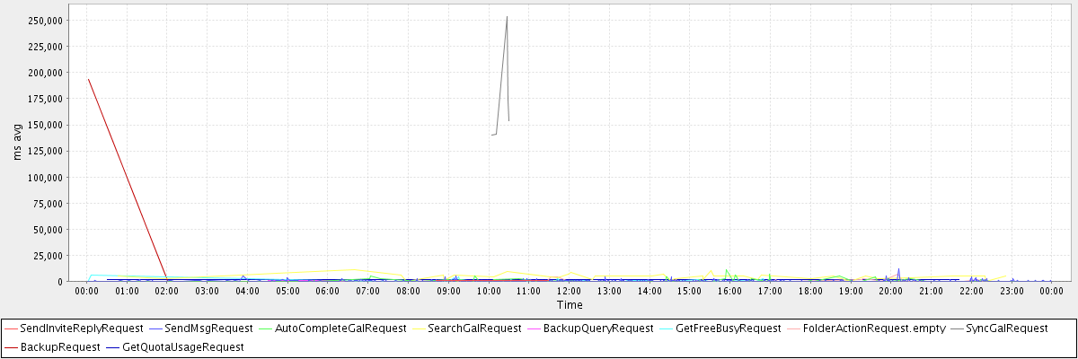avg(SendInviteReplyRequest) = 565.50 avg(SendMsgRequest) = 350.24 avg(AutoCompleteGalRequest) = 1003.38 avg(SearchGalRequest) = 4483.71 avg(BackupQueryRequest) = 671.20 avg(GetFreeBusyRequest) = 542.54 avg(FolderActionRequest.empty) = 519.38 avg(SyncGalRequest) = 172490.80 avg(BackupRequest) = 97105.50 avg(GetQuotaUsageRequest) = 1270.50