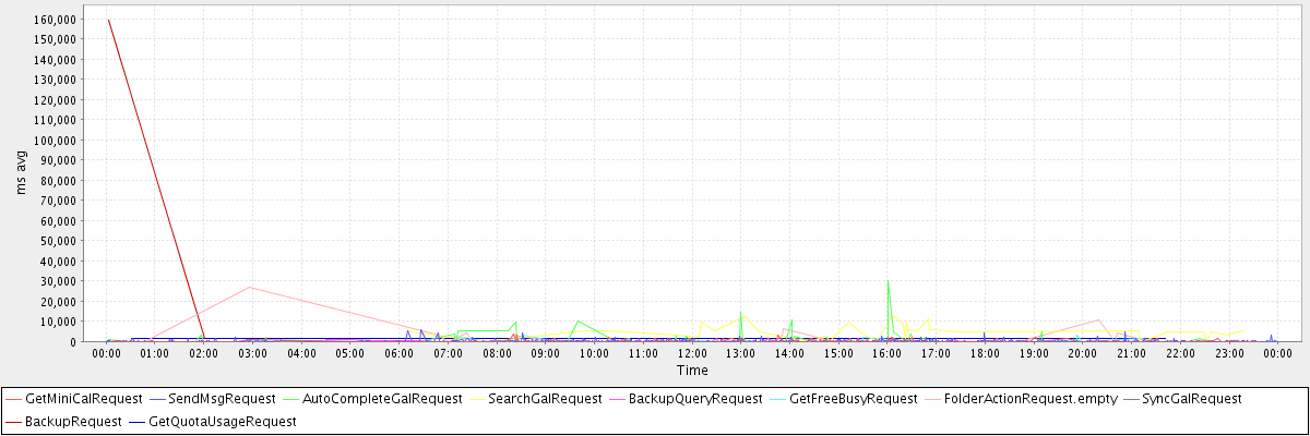 avg(GetMiniCalRequest) = 353.00 avg(SendMsgRequest) = 306.51 avg(AutoCompleteGalRequest) = 1257.66 avg(SearchGalRequest) = 4804.98 avg(BackupQueryRequest) = 698.80 avg(GetFreeBusyRequest) = 446.17 avg(FolderActionRequest.empty) = 1380.22 avg(SyncGalRequest) = 151627.00 avg(BackupRequest) = 80343.50 avg(GetQuotaUsageRequest) = 1303.50