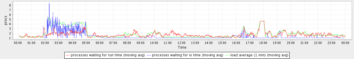avg(processes waiting for run time) = 1.65 avg(processes waiting for io time) = 0.38 avg(load average (1 min)) = 1.85